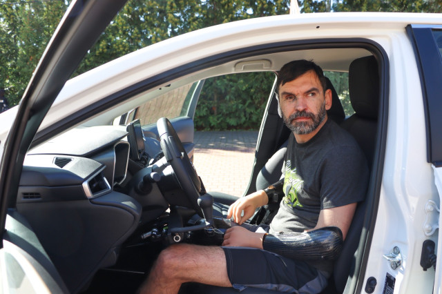 Нацгвардієць Ігор із Рівненщини дізнався про автошколу у реабілітаційному центрі «Галичина». Він має трирічний досвід водіння, але сьогодні вперше сів за кермо авто, переобладнаного на ручне управління.